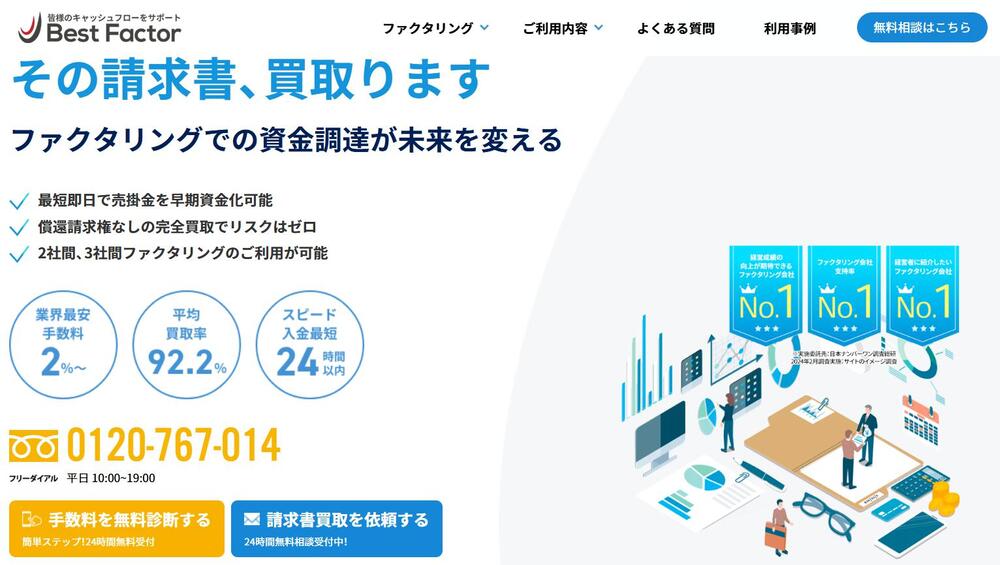 | 特徴 | 電話での5分スピード診断可能 即日振込実行率48.3% 債権譲渡登記の留保が可能 無料の財務コンサルティング付き |